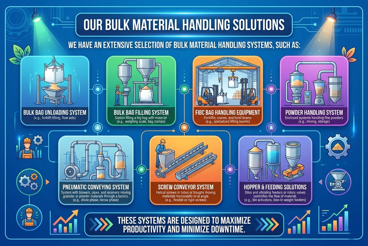 As a leading Bulk Bag Handling System Manufacturer, we understand local industry requirements, environmental conditions, and production challenges. Our Bulk Material Handling Systems are designed to handle: